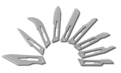 Teräksestä valmistetut kirurgiset terät. Koot: 10, 10A, 11, 11K, 12, 15, 15D, 18, 20, 21, 22, 22A, 23, 24, 25 & 36.