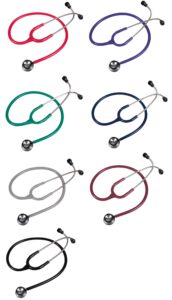 Ruostumatonta terästä. Jokaisen stetoskoopin mukana tulee kaksi varaparia korvaoliiveja, yksi varakalvo ja nimikilpi. |