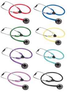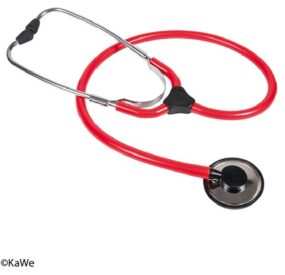 Litteäpäinen stetoskooppi (soveltuu hyvin verenpaineen mittaamiseen, koska mahtuu hyvin verenpainemansetin alle). Vaihdettava kalvo on vahvistettu lasikuidulla ja on siksi erityisen herkkä. |